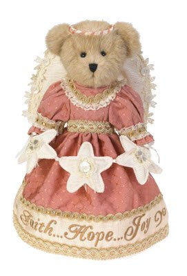 Boyds Bears Faith Hope Joy Angel Bear Christmas Tree Topper Features elegant textured fabric with intricate decorative trims Holds chain of woven stars with button accents Wings feature crocheted lace with button trim Measures approx 12 inches tall Read More..