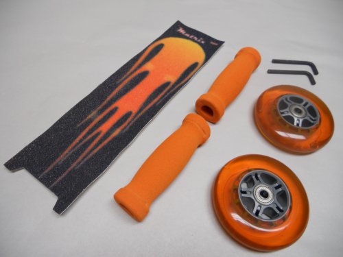 Replacement 98mm Razor Scooter Wheels combo set brbrThis brand new and packaged scooter upgrade kit by Matrix 909 brbrGreat for refurbishing your old Razorbrscooter or customizing the look of a new onebrThe kit comes with 2 Orange polyurethane wheels brSuper fast ABEC 5 Read More..